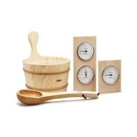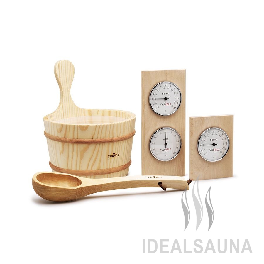 Подарочный набор включает: бадью, термометр/гигрометр, ковш, ароматическое масло.