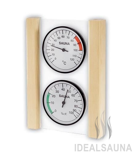 Климатическая станция для сауны с отдельным термометром и гигрометром EOS. Монтируется на стеклянной панели с деревянной рамой.
