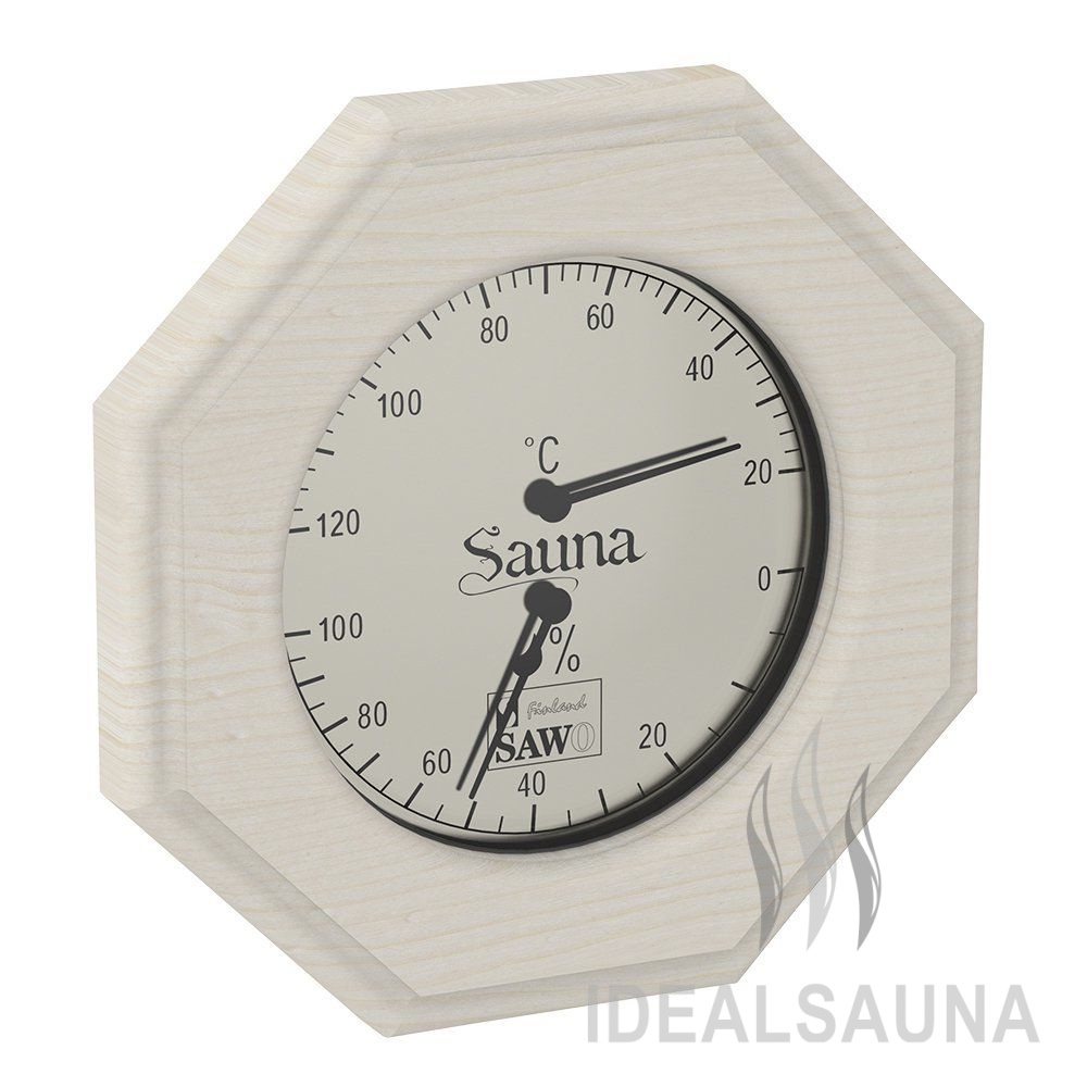 Термогигрометр 241-THA от компании Sawo имеет оригинальную форму равностороннего восьмигранника. В широкой рамке из древесины осины находится большой, круглый, графичный циферблат. Циферблат разделён на две шкалы. Одна из них - это гигрометр, который с точностью измерит уровень влажности, другая - термометр, который сообщит о температуре воздуха. Данный прибор прекрасно подойдёт для использования в парной. Благодаря универсальному дизайну он станет прекрасным дополнением любого интерьера. В нашем интернет-магазине представлен широкий ассортимент измерительных приборов в корпусах из разных видов древесины. Вы можете купить по привлекательной цене модель 241-THA или присмотреться к другим вариантам.