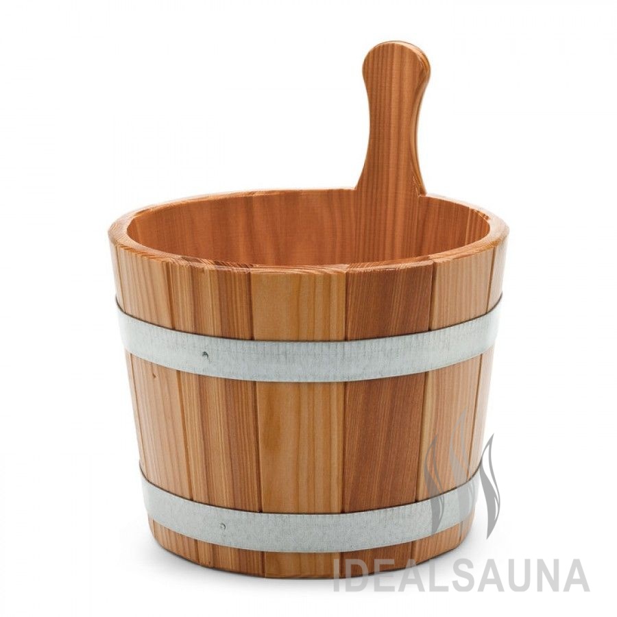 Бадья для сауны объемом 5 литров. Внутри и снаружи — бесцветное гигиеническое покрытие. Абсолютно водонепроницаема. Два обруча из оцинкованной стали. Удлиненная бочарная дощечка в качестве ручки.