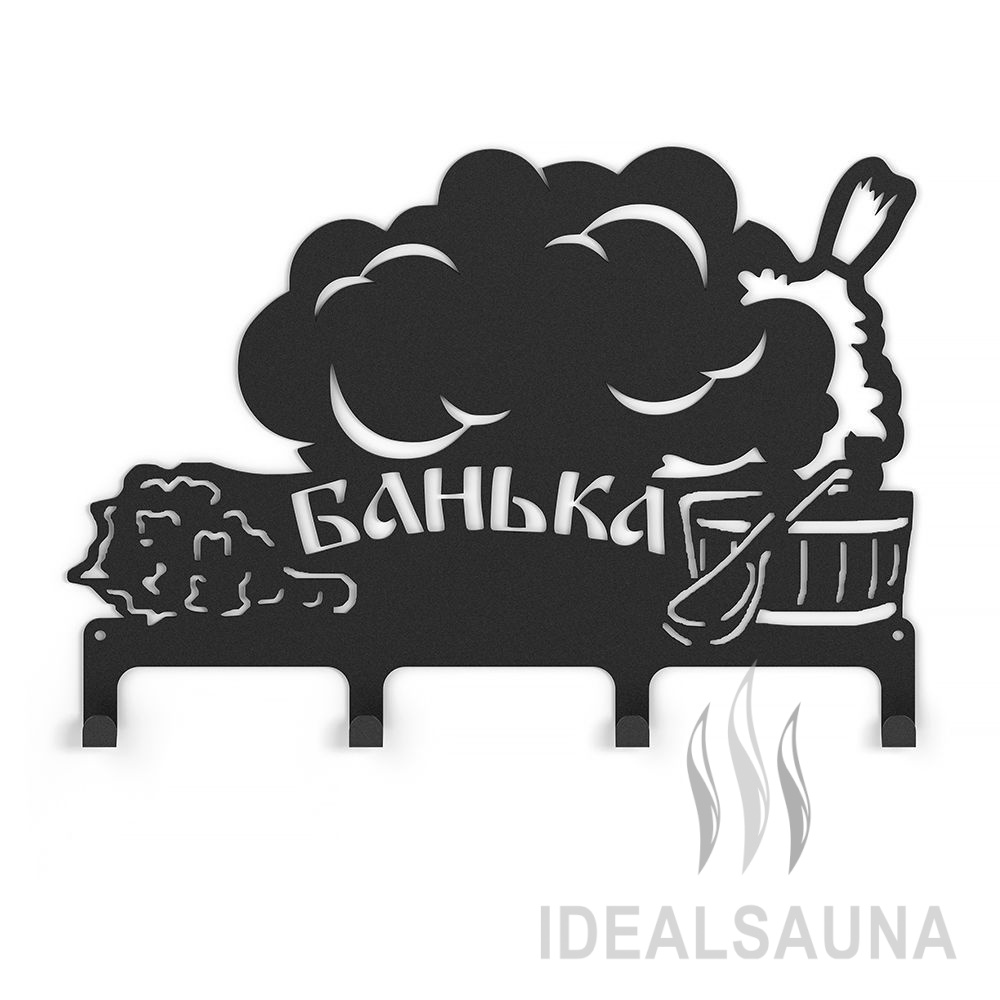 Вешалка "Банька 1" выполнена в дизайне с прорезными узорами в виде банных аксессуаров и гармонично впишется в банное пространство.