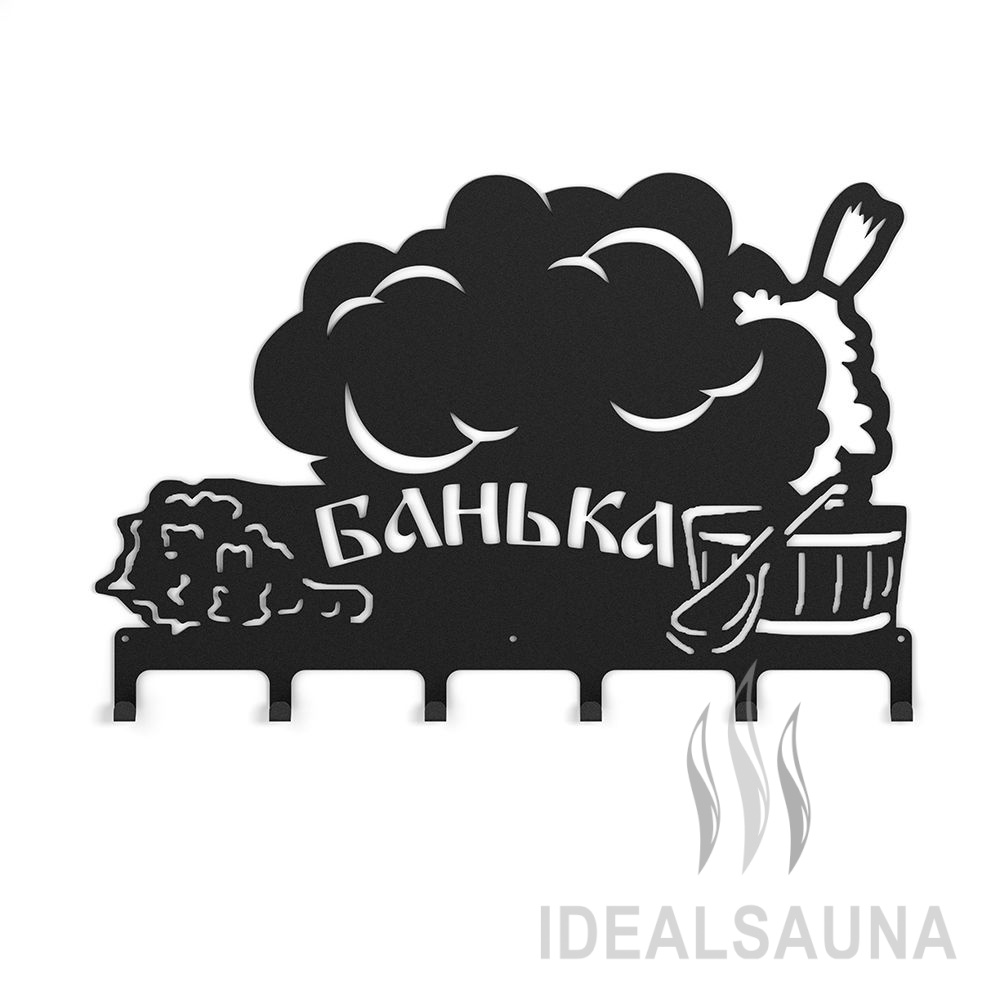 Вешалка "Банька 1" выполнена в дизайне с прорезными узорами в виде банных аксессуаров и гармонично впишется в банное пространство.