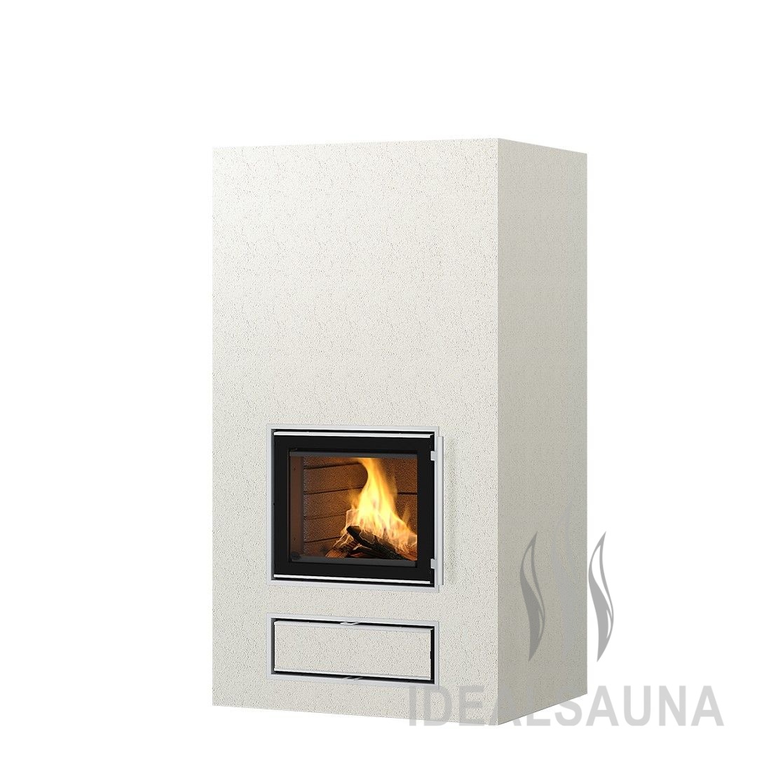 Модель Kaila V1 с тактильно приятной фактурной оштукатуренной поверхностью. Камин может быть выполнен в двух вариантах высоты и с многочисленными вариантами подключения к дымоходу (нижнее/верхнее/верхнее боковое/верхнее заднее подключение). В топке печи-камина можно готовить после прогорания дров.