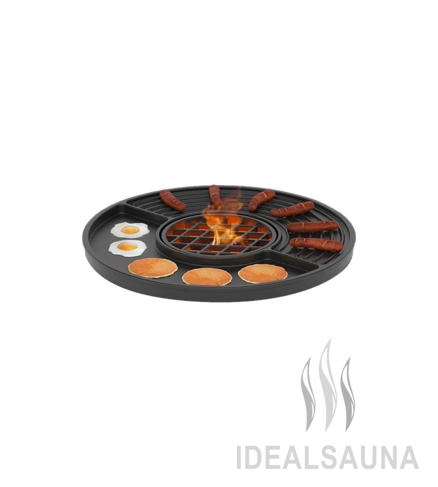 Небольшой бортик по краю плиты ограничивает рабочее пространство, предотвращает попадание жира в огонь и его возгорание. В середине плиты размещена чугунная решётка Везувий Стейк. Эта решётка предназначена для готовки мяса и овощей с красивым диагональным рисунком. Большая теплоёмкость чугуна позволяет быстро приготовить на очаге мясо, рыбу, овощи, грибы и другие продукты в различных вариациях.