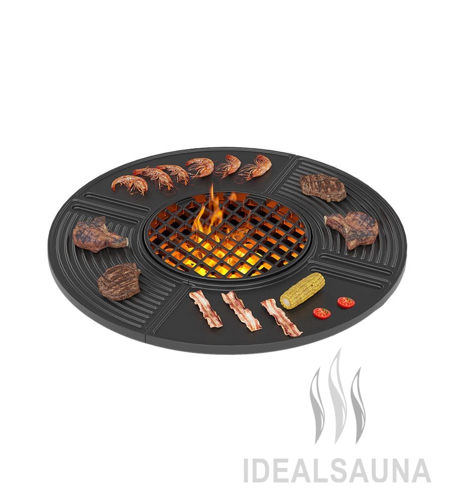 Небольшой бортик по краю плиты ограничивает рабочее пространство, предотвращает попадание жира в огонь и его возгорание. В середине плиты размещена чугунная решётка Везувий Стейк. Эта решётка предназначена для готовки мяса и овощей с красивым диагональным рисунком. Большая теплоёмкость чугуна позволяет быстро приготовить на очаге мясо, рыбу, овощи, грибы и другие продукты в различных вариациях.