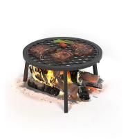 Подставка не займёт много места в багажнике автомобиля. Она устанавливается над костром, на ней размещается круглая решётка и вы можете готовить мясо, рыбу, овощи с клетчатым рисунком настоящего гриля!
