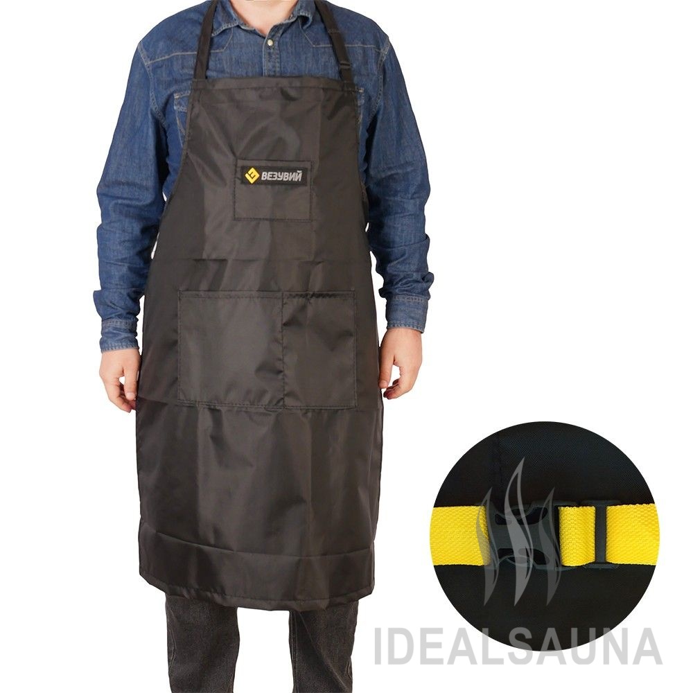 Фартук Везувий изготовлен из полиэстера – материала, за которым легко ухаживать. Полиэстер обладает водоотталкивающими свойствами, что дополнительно защитит вас при работе на кухне или у открытого огня.