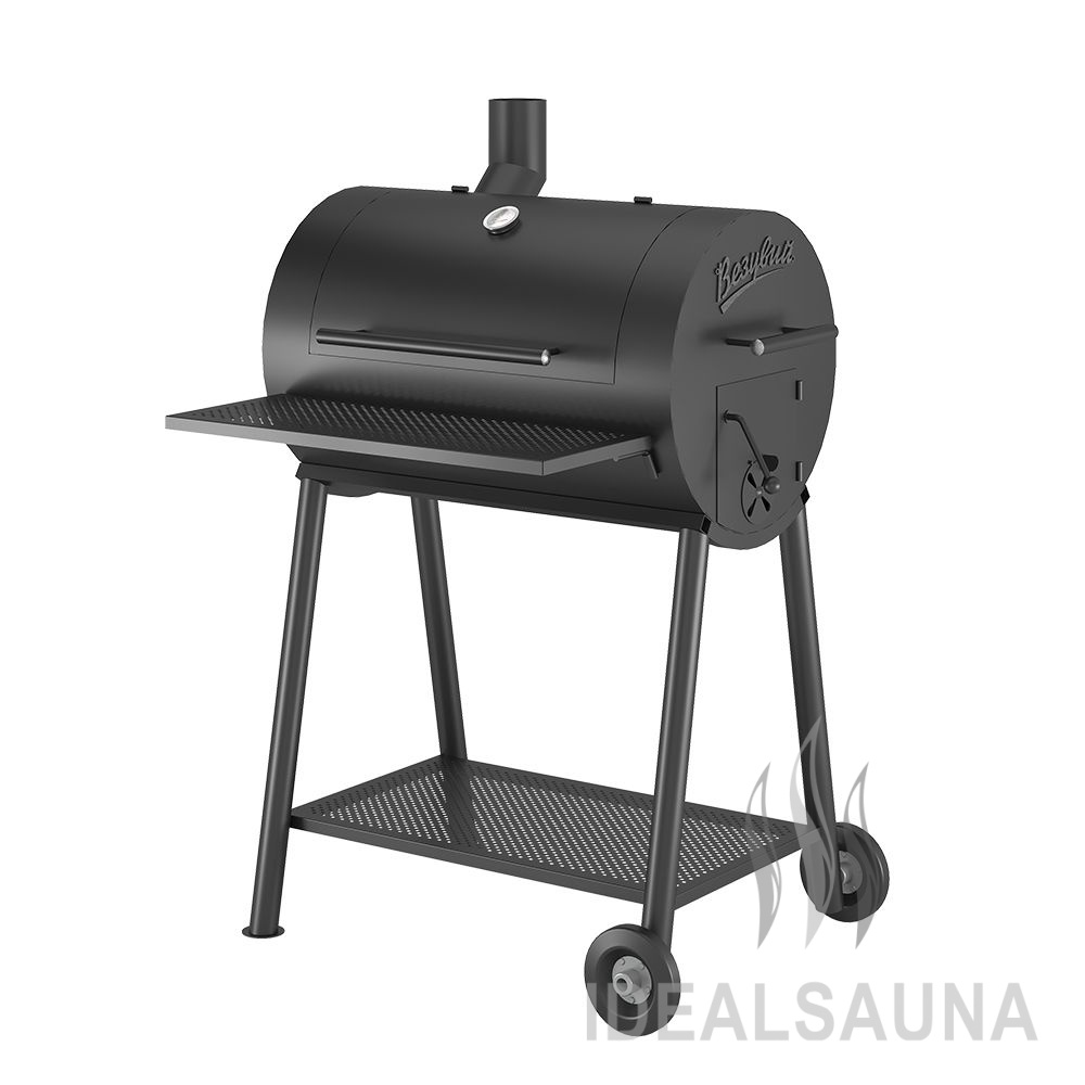 Для удобного использования на передней поверхности смокера сделана съёмная стальная полка для размещения продуктов и посуды. Смокер установлен на подставке с надёжными стальными ножками. В нижней части подставки сделана полка, на которой удобно хранить дрова и инструменты для работы со смокером. Две ножки смокера оснащены колёсами для удобства перемещения изделия по зоне барбекю. Для перекатывания смокера используется ручка на боковой стороне основного модуля смокера.