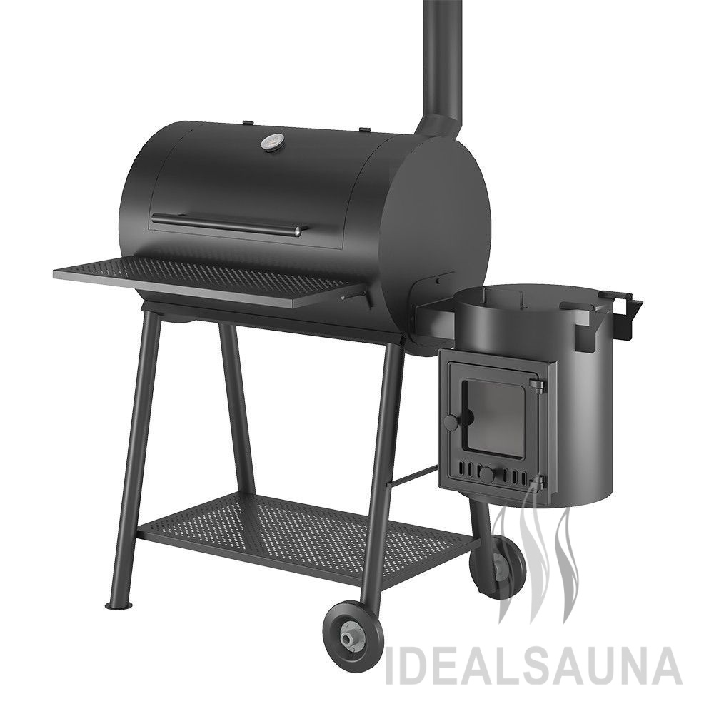 Для удобного использования на передней поверхности смокера сделана съёмная стальная полка для размещения продуктов и посуды. Смокер установлен на подставке с надёжными стальными ножками. В нижней части подставки сделана полка, на которой удобно хранить дрова и инструменты для работы со смокером. Две ножки смокера оснащены колёсами для удобства перемещения изделия по зоне барбекю. Для перекатывания смокера используется ручка на боковой стороне основного модуля смокера.