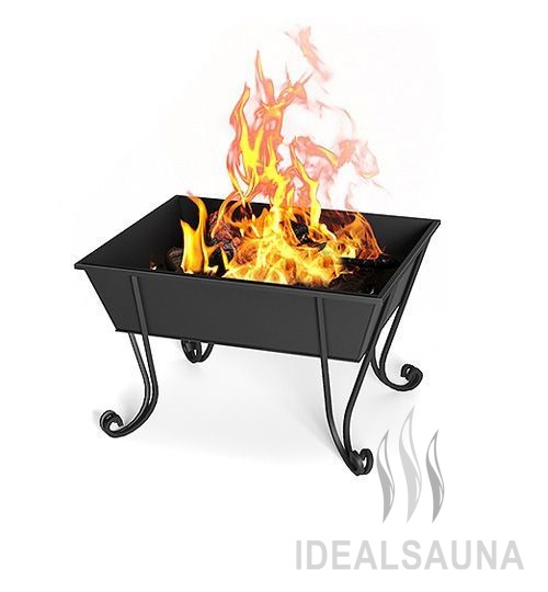 Устройство изготовлено из конструкционной стали толщиной 3 мм. Такая сталь хорошо выдерживает высокие температуры и значительную весовую нагрузку. Высота костровой чаши делает контроль за горящим огнём более удобным, облегчает подкладывание дров, ворошение углей и уход за самим устройством. Скошенные боковые стенки костровой чаши облегчают уборку не прогоревших дров, углей и золы. Для усиления конструкции по её верхнему краю приварен квадратный металлический пруток сечением 10 мм, предотвращающий деформацию стенок чаши и нарушение геометрических пропорций. Из такого же прутка сделаны изящные кованые ножки костровой чаши, вносящие в дизайн конструкции элементы изыска.
