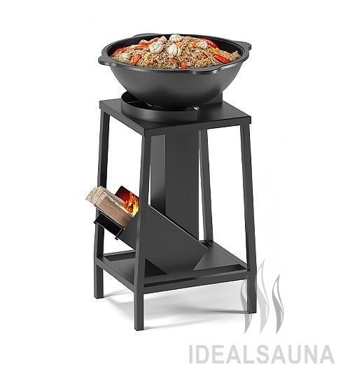 Подставка-подстолье надёжно удерживает топочную часть конструкции, не давая ей раскачиваться и шататься во время использования. Высота печи 58 см, что делает облуживание казана более удобным, исключает необходимость низко наклоняться или присаживаться во время готовки.