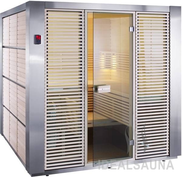 Передняя стена имеет стеклянные окна. Решетки, установленные снаружи на окнах, подчеркивают стиль внутреннего интерьера сауны. Рама основания с металлическим покрытием и регулируемые ножки защищают стены и остальные элементы сауны от влаги, испаряющейся с пола.