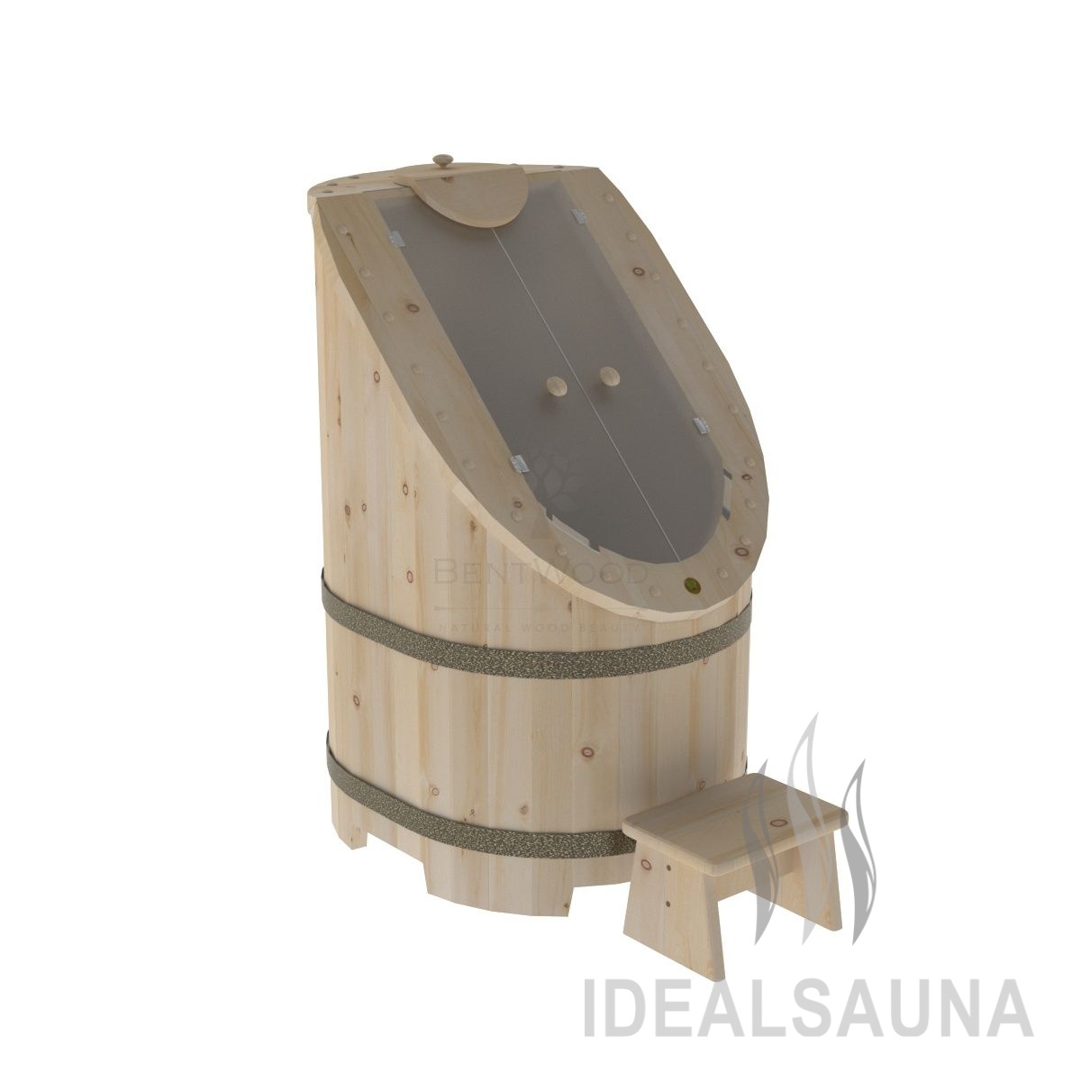 Компания Bentwood предлагает изготовленные из сибирского кедра фитобочки с стеклянными дверцами. Скос дает не только улучшенный обзор, но и позволяет обеспечить более комфортное положение головы человека.
