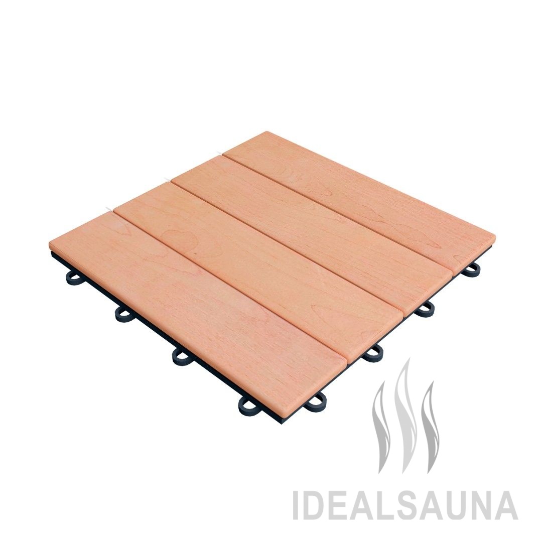 Садовый паркет формируется из небольших плиток. Каждый элемент состоит из пластиковой основы и закрепленной на ней планки из древесины. Сосна обрабатывается теплом и паром без применения химических составов.