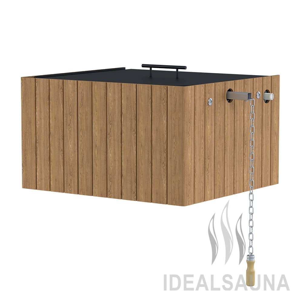 Для ценителей контраста ЭВЕРЕСТ предлагает обливное устройство, позволяющее в течение короткого времени получить массив холодной воды, достаточной для создания температурного перепада по всему телу. Обливное устройство EVEREST WOOD ДУБ представляет собой бак из нержавеющей стали, автоматически наполняемый водой. Количество воды в баке регулируется с помощью клапана подачи воды. Максимальный объём воды в баке – 35 литров. Бак обливного устройства устанавливается на высоте 2-2,2 метра. Вода для облива после парилки подаётся с помощью рукоятки на цепи. Широкое основание бака с большим количеством мелких отверстий обеспечивает оптимальный по размеру и интенсивности поток воды. Равномерная подача большого объёма воды обеспечена за счёт трех выпускных клапанов, одновременно открывающихся при потягивании рукоятки вниз.