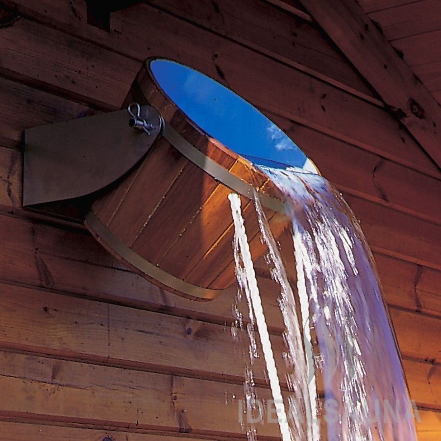 Обливное ведро для использования на открытом воздухе. Внутренняя отделка выполняется из полимера, устойчивого к ультрафиолету, а снаружи используется воск, надежно предохраняющий древесину от осадков и солнечных лучей.