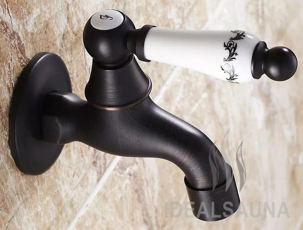 Однорычажный кран черного цвета с поворотной ручкой удобен в эксплуатации. На ручке имеется белая керамическая вставка с оригинальной росписью, что смотрится очень необычно. Стойкое покрытие предназначено для использования в условиях высоких температуры и влажности.