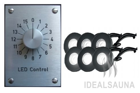 Система освещения для саун WDT. Эти светильники для саун выдерживают высокую температуру, они разработаны специально для использования в саунах. Комплект поставки включает 6 ламп, но опционально возможно установить до 10 ламп, большее количество ламп монтируется только при использовании специального Slave модуля. Стоит отметить, что диодные светильники не потребляют много энергии, а так же время их службы гораздо выше, чем у галогеновых аналогов.