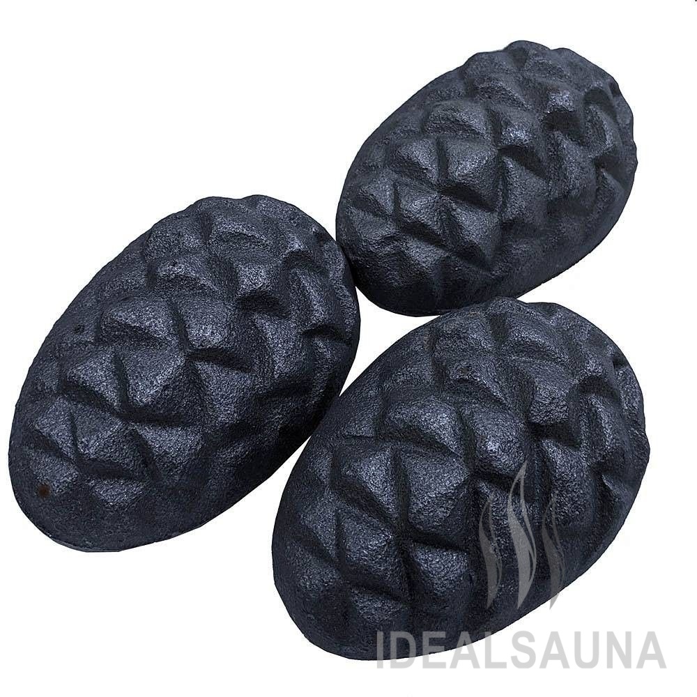 Шишки устанавливаются вертикально, низ шишки имеет ровную поверхность, что обеспечивает большее пятно контакта с поверхностью печи. Последующие верхние ряды над шиками могут быть выложены камнем. Чугун в несколько раз теплопроводнее любого камня, поэтому он очень быстро набирает тепло. Его задача быстро аккумулировать тепло и быстро передать его камню (при смешанной засыпке). Парные, где в печи половина или две трети чугуна, разогреваются в два раза быстрее нежели при загрузке печи только камнем.