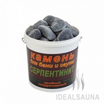 Серпентинит, он же змеевик, экологически чистый горный минерал темно зеленого цвета со светлыми прожилками. По своим свойствам очень похож на жадеит, но является более доступным по цене. Обладает превосходными теплоаккумулирующими свойствами и неповторимым естественным видом, отдает в парилку только мягкое и бархатистое тепло, которое будет сохраняться в течение многих часов. Пар бани с этим камнем становится лечебным.