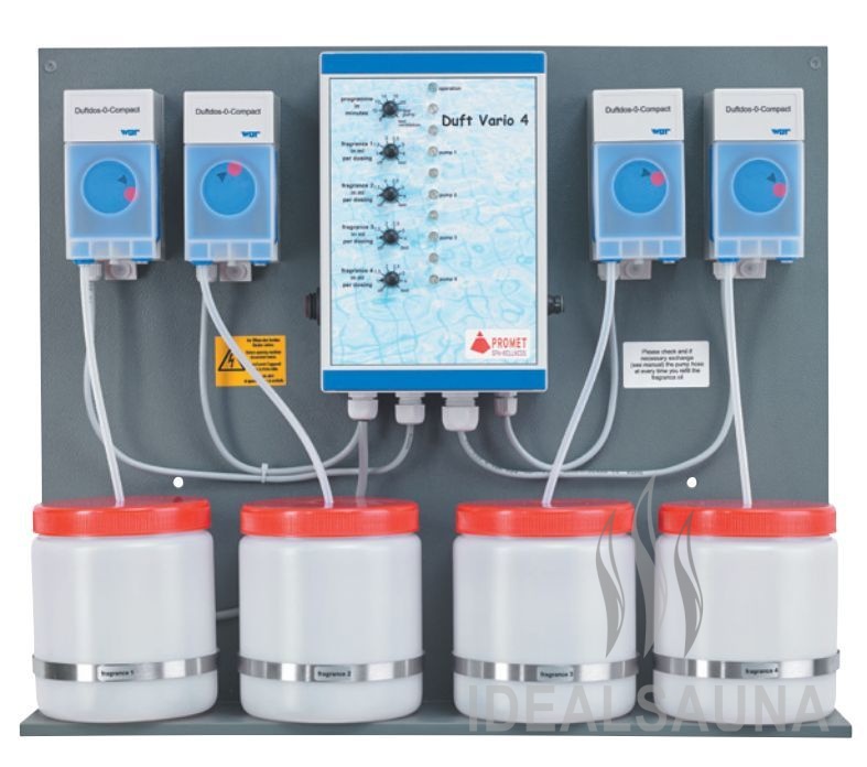 Дозирующая станция WDT с возможностью выбора от 2 до 4 ароматических веществ. Интенсивность ароматизации регулируется по каждому запаху индивидуально. Инжектор ароматического вещества монтируется непосредственно в паропровод. Таким образом, ароматный пар наполняет парную, создавая особую атмосферу каждой процедуры, в зависимости от использованного запаха. Выбор аромата можно осуществлять с выносного пульта управления, который находится непосредственно в парной. Интенсивность дозирования устанавливается индивидуально для каждого аромата на регуляторе. Во время дозирования выбранного аромата клапан на других насосах закрыт.