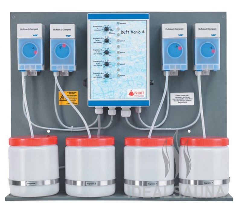Дозирующая станция WDT с возможностью выбора от 2 до 4 ароматических веществ. Интенсивность ароматизации регулируется по каждому запаху индивидуально. Инжектор ароматического вещества монтируется непосредственно в паропровод. Таким образом, ароматный пар наполняет парную, создавая особую атмосферу каждой процедуры, в зависимости от использованного запаха. Выбор аромата можно осуществлять с выносного пульта управления, который находится непосредственно в парной. Интенсивность дозирования устанавливается индивидуально для каждого аромата на регуляторе. Во время дозирования выбранного аромата клапан на других насосах закрыт.