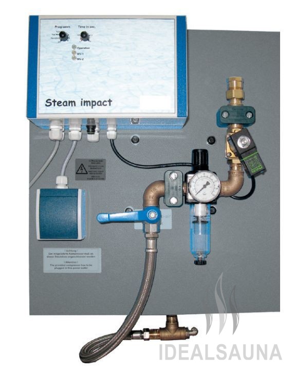 "Паровой удар" - это процедура резкой подачи сжатого воздуха на горячий пар, скопившийся под потолком кабины. Форсунки устанавливаются над каждым сидячим местом в парной, и после нажатия кнопки горячий пар окутывает посетителей кабины. Эффект напоминает резкое повышение температуры в сухой сауне после увлажнения горячих камней. Техническое оборудование представляет собой пневматический компонент, безмасляный компрессор с компенсационным баком, кнопку запуска и форсунку.