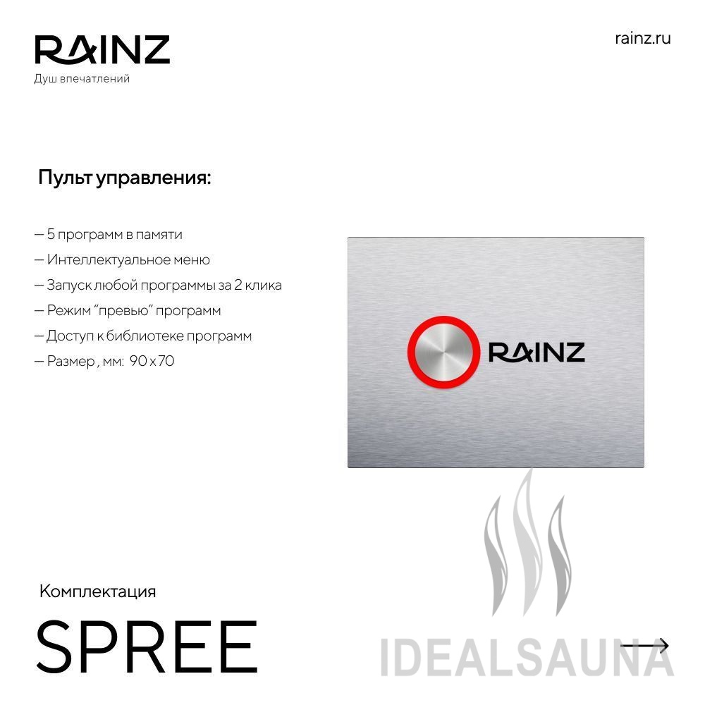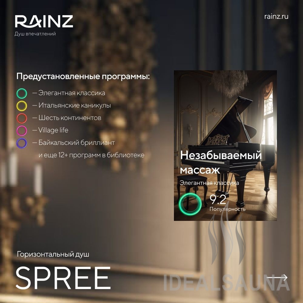 - Блок управления с одной сенсорной пьезо-кнопкой, с подсветкой. Удобная и безопасная при работе в условиях высокой влажности и под водой. С помощью умного интерфейса Душа впечатлений RAINZ позволяет запускать любую из установленных программ всего двумя нажатиями.