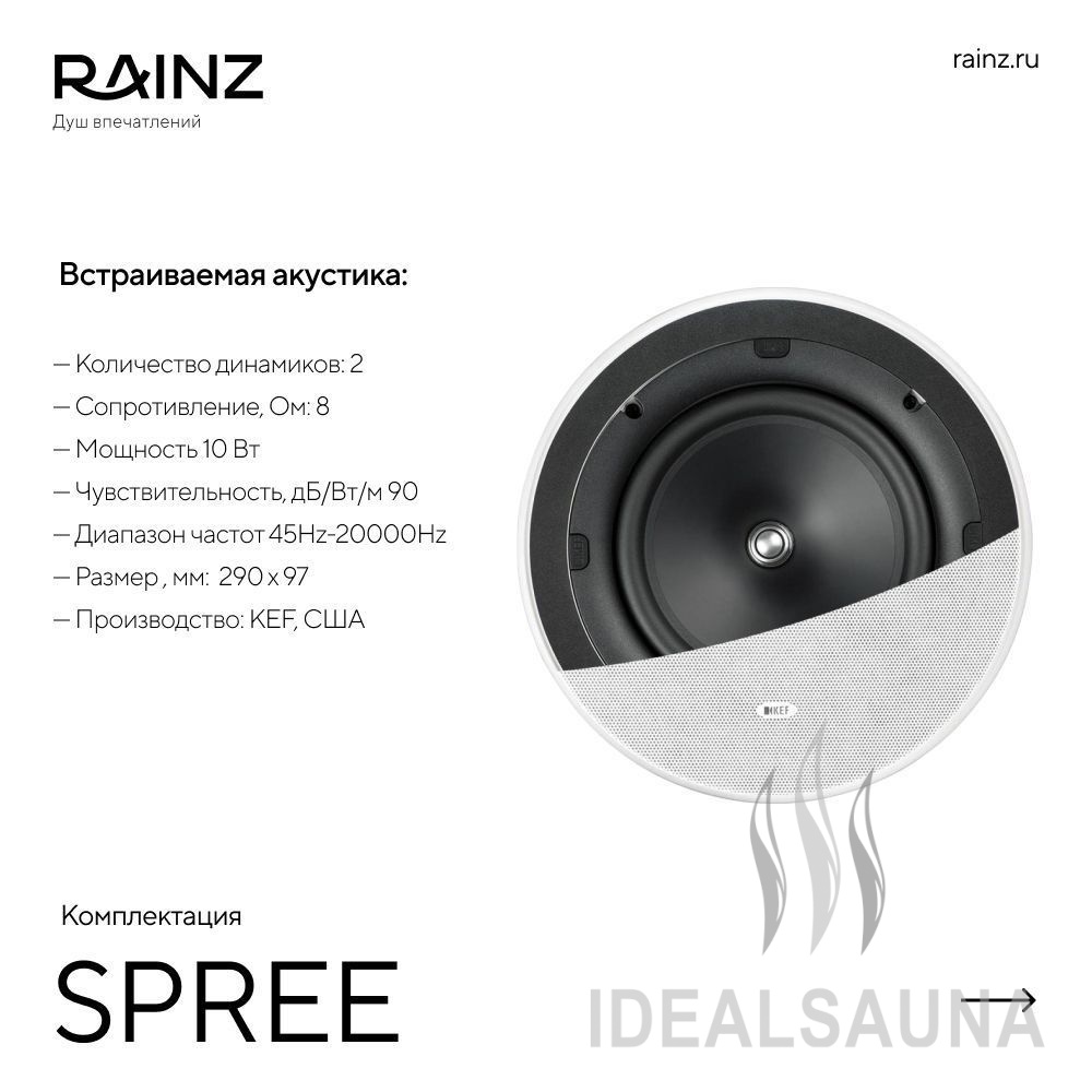 Принимайте душ лежа с RAINZ SPREE! Невероятно расслабляющее воздействие шести независимых форсунок. Каждая форсунка работает, с теплой и с холодной водой. Эффекты мягкого дождя при одновременной работе всех форсунок или интенсивный массаж при работе одной-двух форсунок. Звук Hi-Fi, мягкое сценарное освещение RAINZ SCENE и великолепные итальянские форсунки.