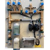 Единая монтажная панель в сборе, включающая: контроллер управления форсунками, музыкой, светом, термостат, комплект запорных кранов и фильтров, гасители гидроударов. Управление 8 независимыми форсунками.