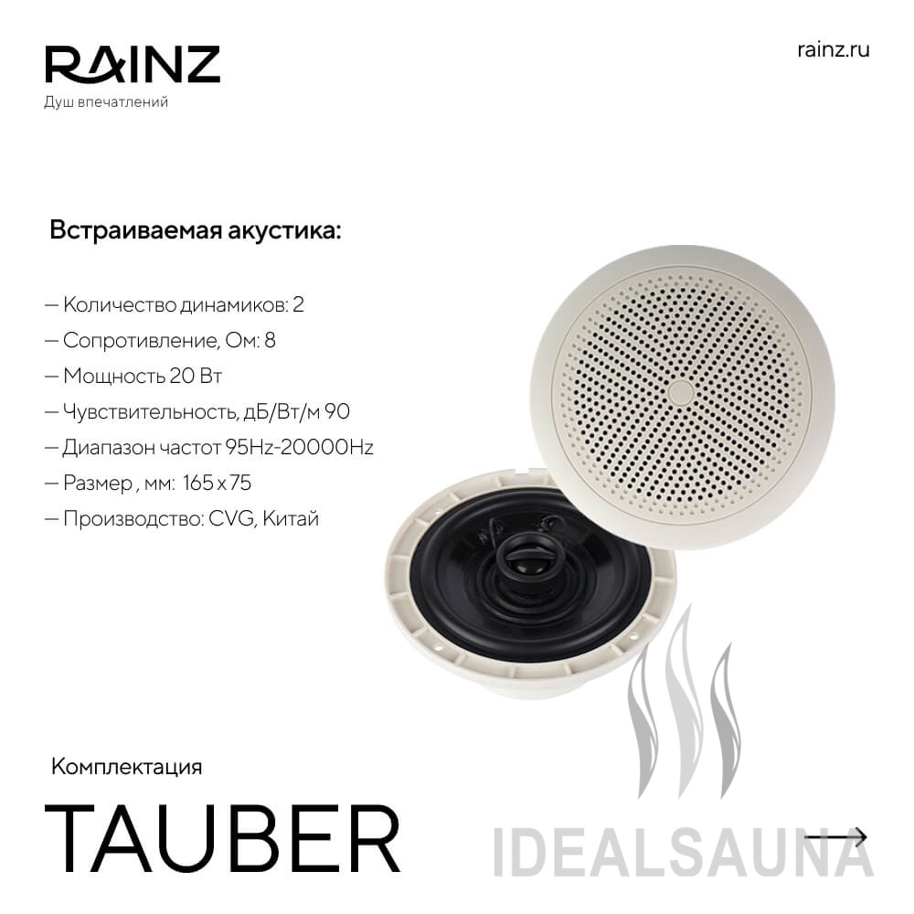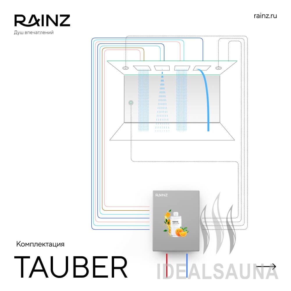 - Комплект из четырех верхних душевых леек.Нержавеющая сталь, цвет хром, страна производитель Италия, функции: дождь, водопад (2 вида), туман (распыление 4 форсунки), RGB подсветка интегрирована в Душ впечатлений RAINZ и работает под его управлением.
