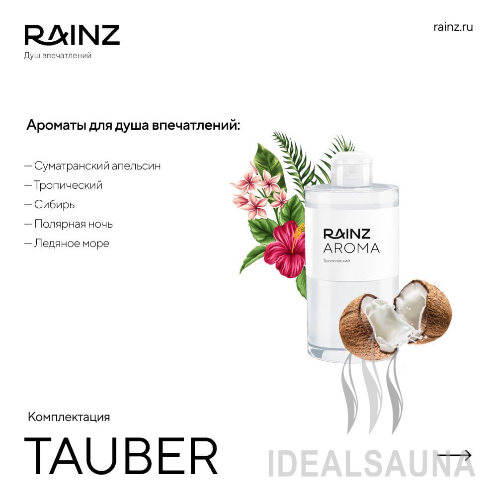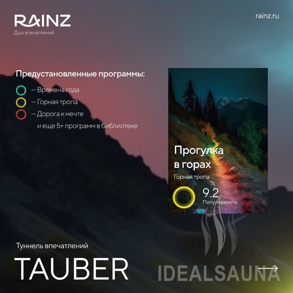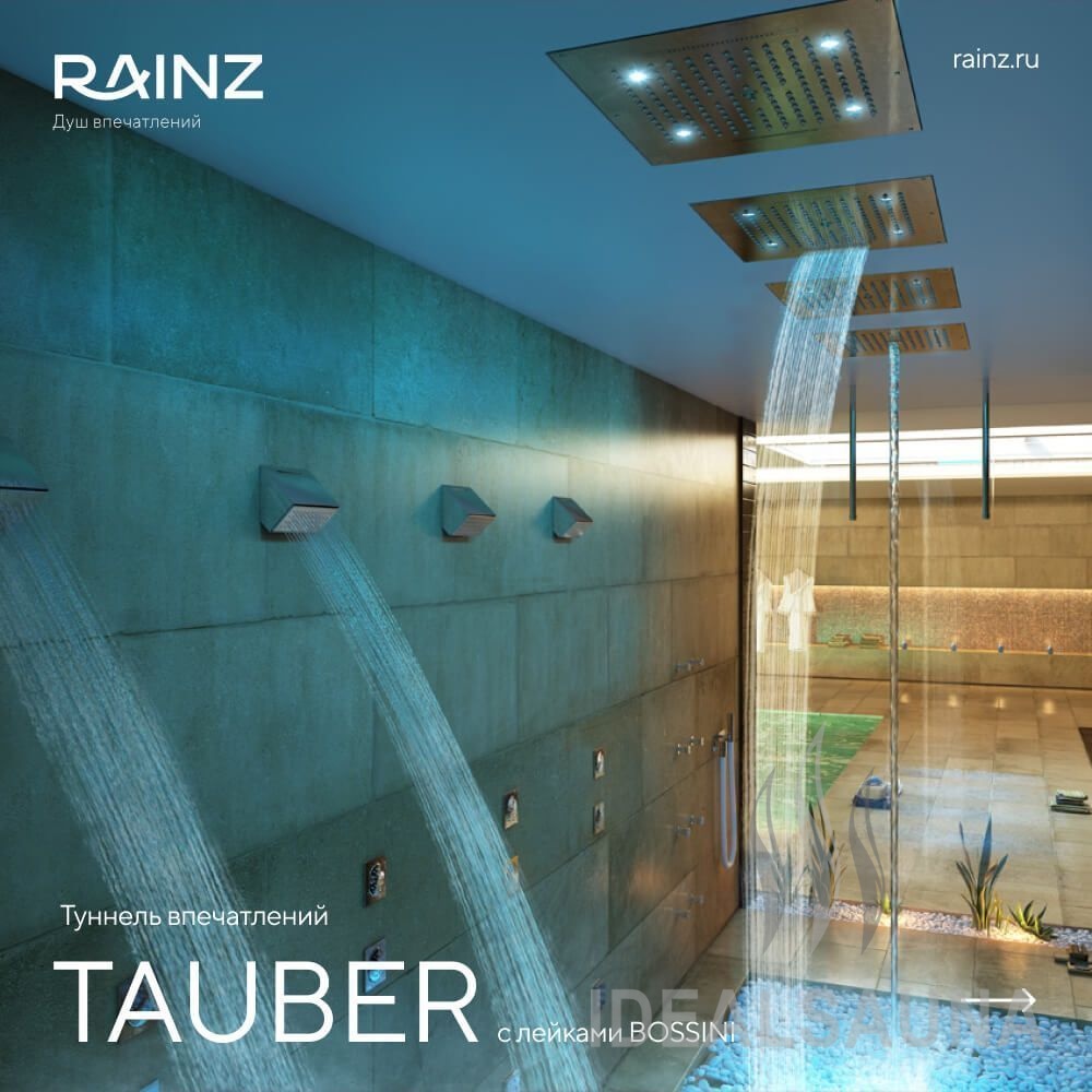 Добавьте движения к водным процедурам, а программы впечатлений RAINZ наполнят туннель эмоциями. Туннель впечатлений RAINZ TAUBER – это путешествие в грезы и мечты! Каждый шаг будет переносить вас в новые климатические и визуальные впечатления. Освещение сменяется в ритме движения, подчеркивая активную зону и помогая погрузиться в атмосферу.