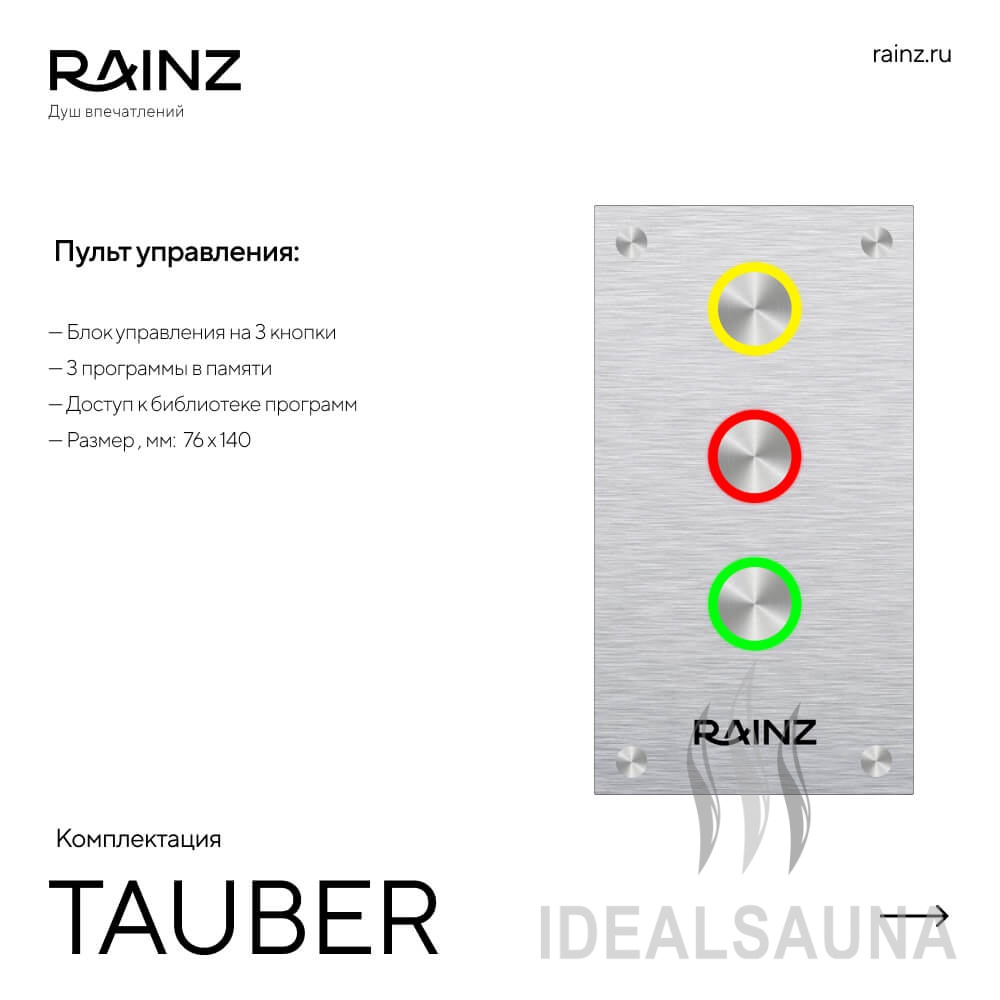 - Блок управления на три сенсорные пьезо-кнопки, с подсветкой. Удобная и безопасная при работе в условиях высокой влажности и под водой. С помощью умного интерфейса Душа впечатлений RAINZ позволяет запускать любую из предустановленных программ одним нажатием. Каждый цвет соответствует одной программе. Работа с режимом "превью" программы или моментальным запуском.