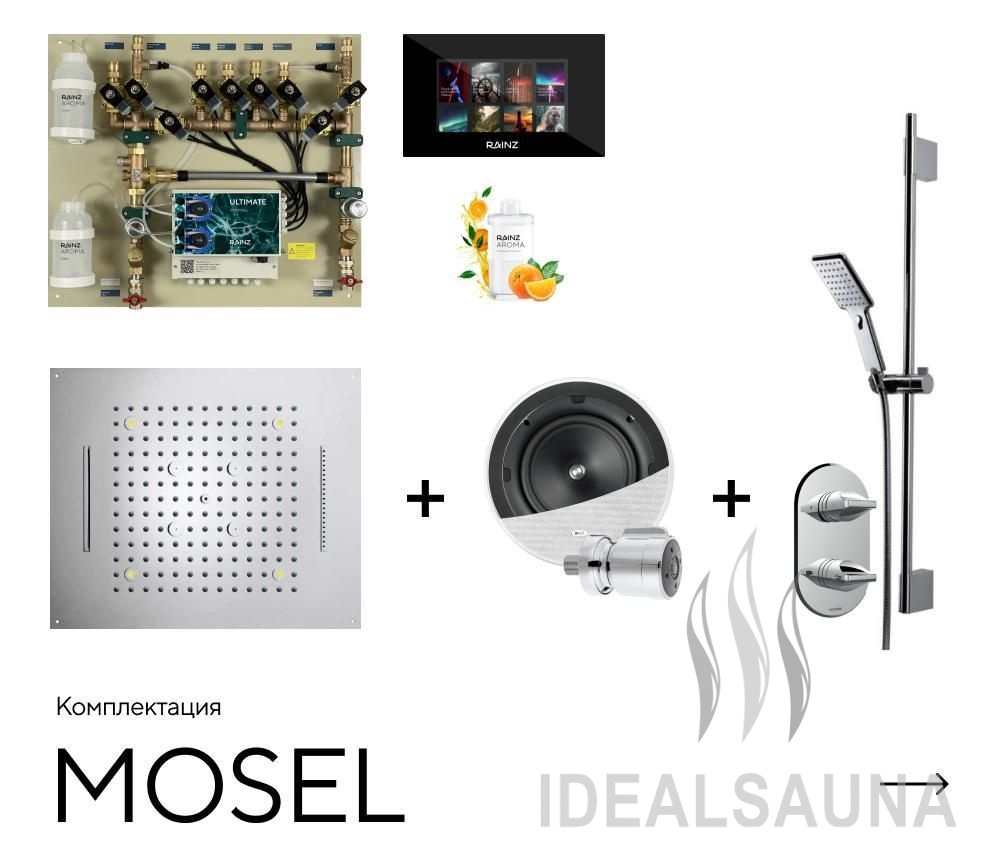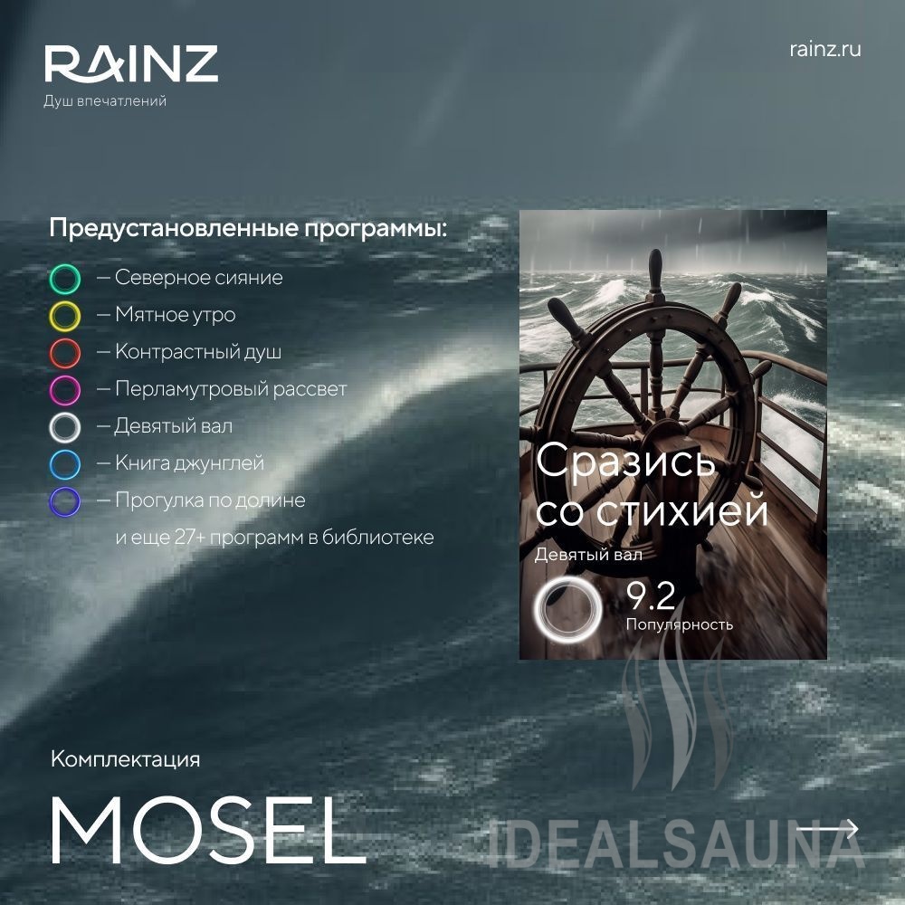 Самая богатая комплектация Душа впечатлений RAINZ! Итальянская верхняя лейка с четырьмя видами потоков воды, три уровня боковых форсунок, две станции ароматизации. Цветной сенсорный 8’’ экран, Hi-Fi система, двух-режимные боковые форсунки, а также ручной душ и термостат на 5 выходов. Комплект сценарного освещения RAINZ SCENE.