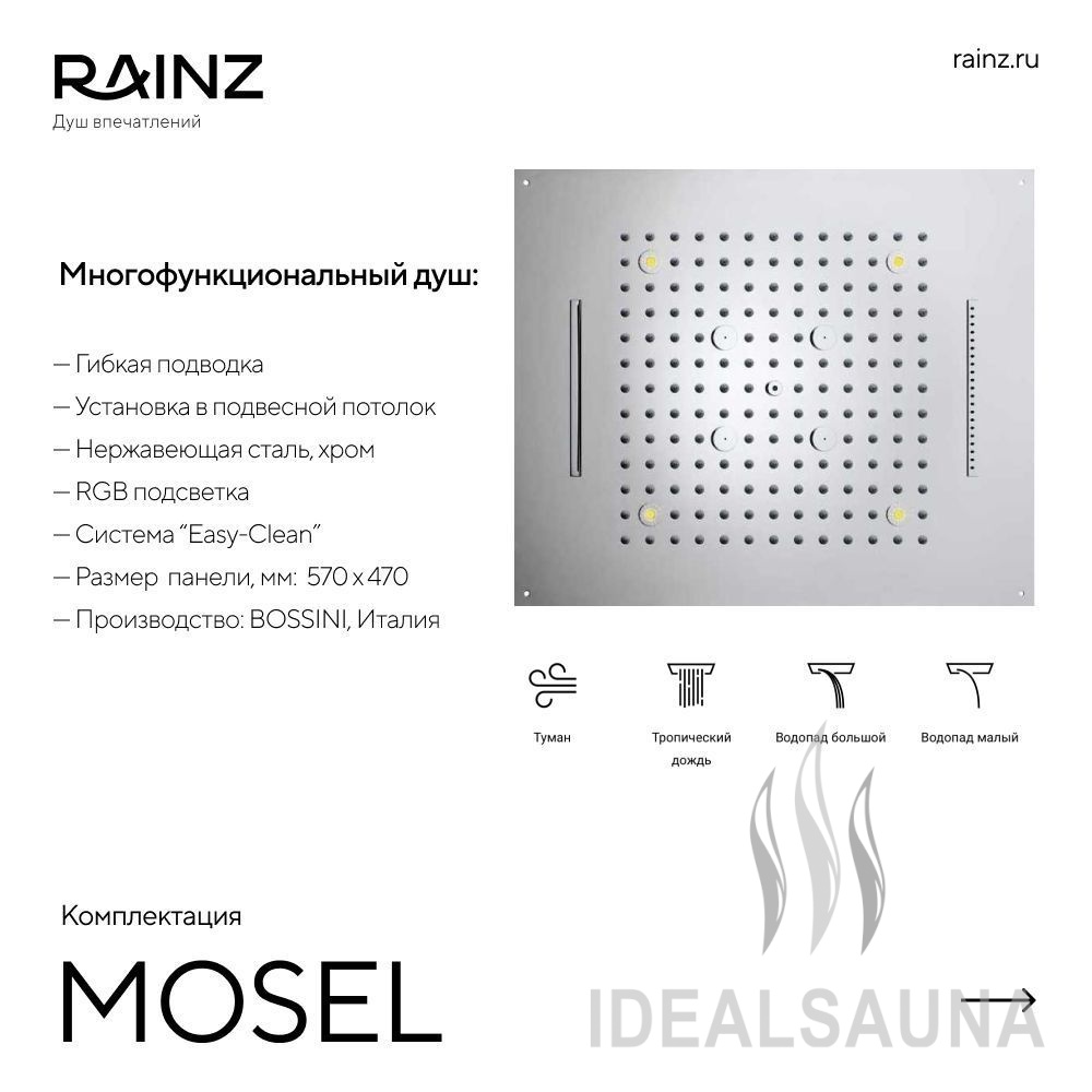 - Верхняя душевая лейка H38908.Нержавеющая сталь, цвет хром, страна производитель Италия, функции: дождь, водопад (2 вида), туман (распыление 4 форсунки), RGB подсветка интегрирована в Душ впечатлений RAINZ и работает под его управлением.