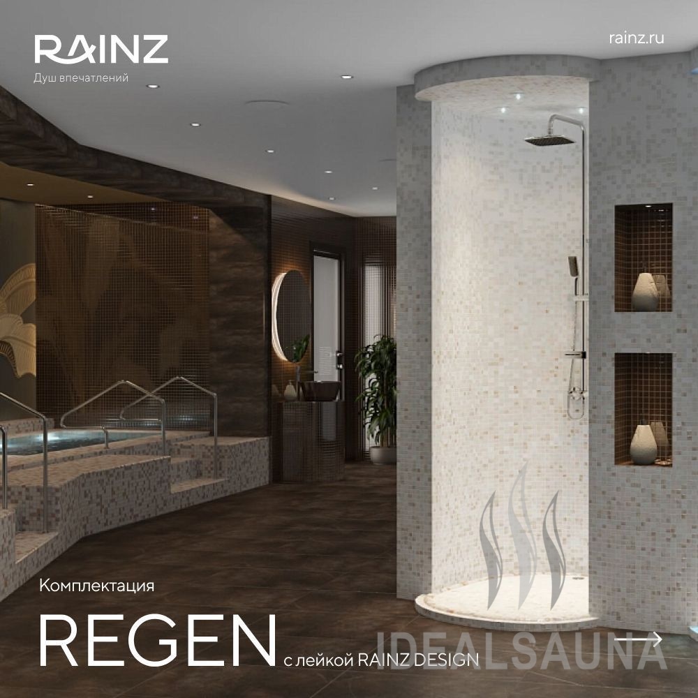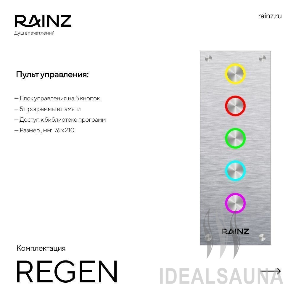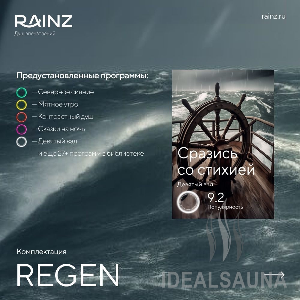 Классический вертикальный душ впечатлений RAINZ REGEN. Круглая верхняя лейка DESIGN, четыре вида потоков воды, три уровня боковых форсунок. Пяти-кнопочный пульт управления для быстрого запуска программ, акустическая система, распыляющие боковые форсунки. Для полноты ощущений в комплектацию входит сценарное освещение RAINZ SCENE по периметру верхней лейки.