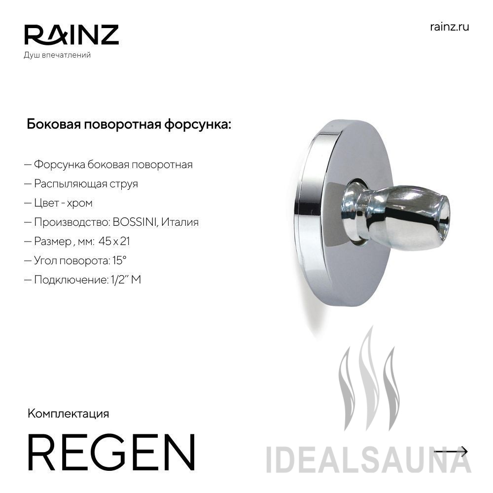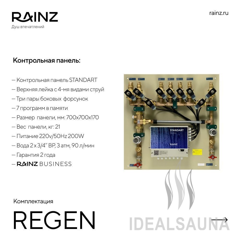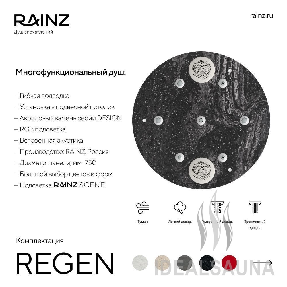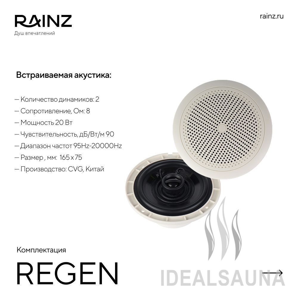Классический вертикальный душ впечатлений RAINZ REGEN. Круглая верхняя лейка DESIGN, четыре вида потоков воды, три уровня боковых форсунок. Пяти-кнопочный пульт управления для быстрого запуска программ, акустическая система, распыляющие боковые форсунки. Для полноты ощущений в комплектацию входит сценарное освещение RAINZ SCENE по периметру верхней лейки.