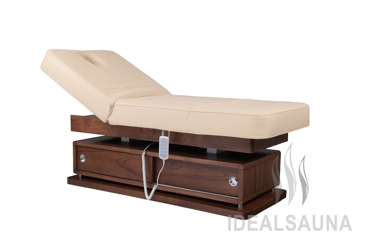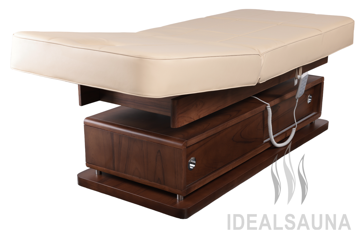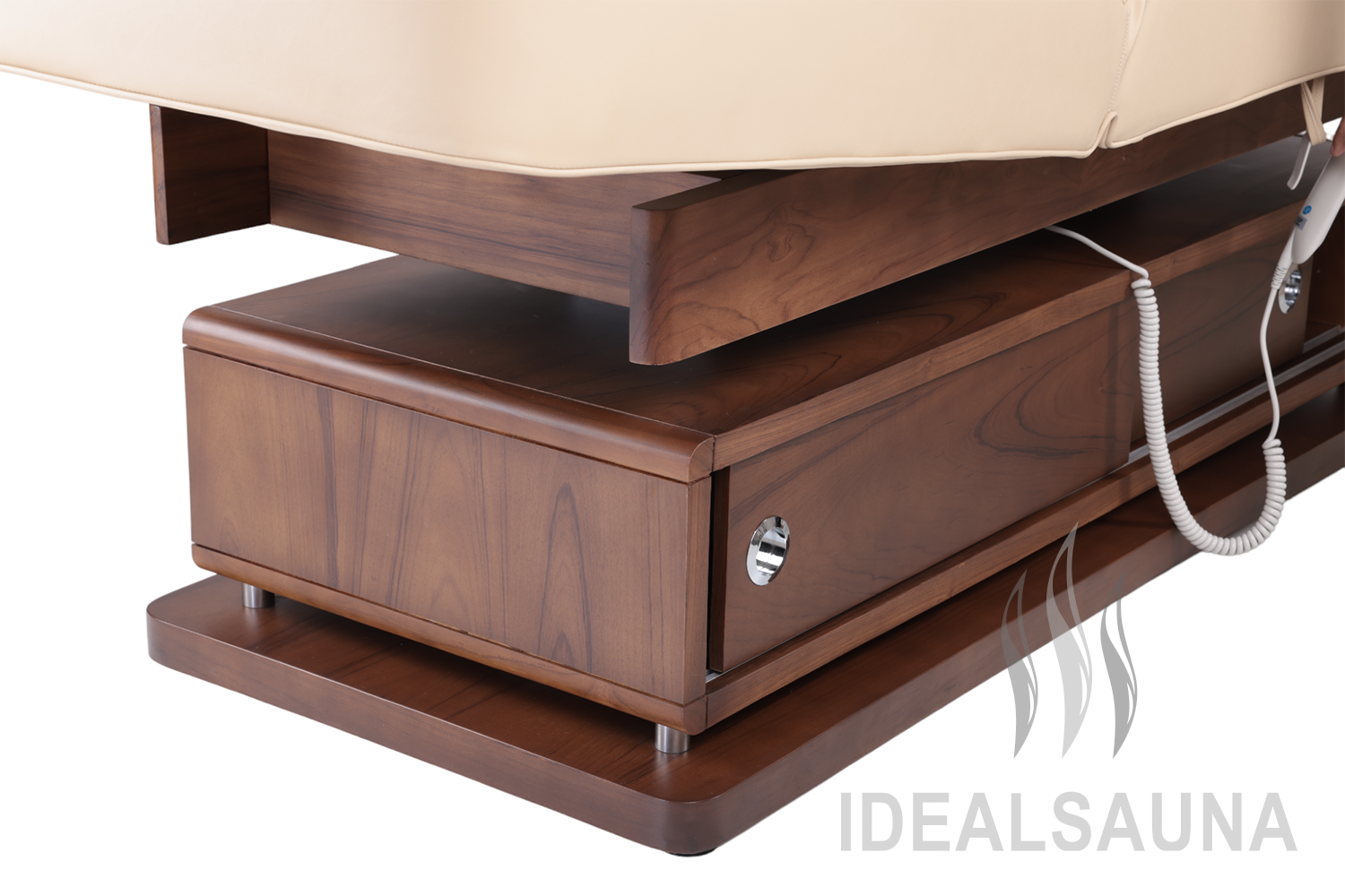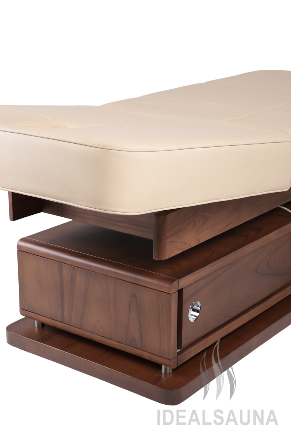 Матрас изысканного песочного оттенка обеспечивает оптимальный комфорт во время процедур. Основание кровати изготовлено из высококачественной древесины с отделкой «Teak Yellow». Этот материал придает кушетке элегантность, обеспечивая долгий срок службы. Закругленные отсеки с раздвижными дверцами представляет собой удобное место для хранения оборудования, полотенец и всех необходимых материалов для эффективных сеансов процедур.