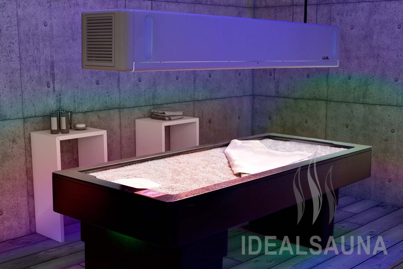С незапамятных времен песчаные бани известны противовоспалительным и обезболивающим эффектом. Благодаря своему химико-физическому составу, теплый кварцевый песок, нагретый до 32°C - 40°C - обладает очищающими, дезинфицирующими и излечивающими действиями и расслабляет мышцы, кости и суставы. СПА-кушетка имеет следующую конструкцию: поддон из нержавеющей стали, наполненный песком. При нагреве внутри поддона создается сухой микроклимат, который препятствует распространению бактерий и плесни, поддерживая гигиеническую чистоту песка.