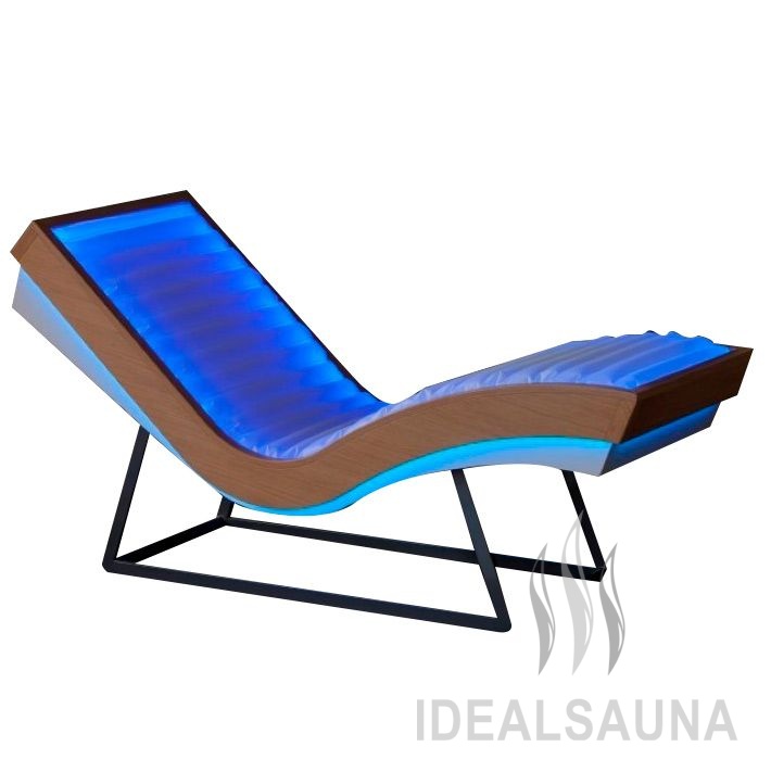 В основание шезлонга встроена цветная светодиодная подсветка, смена цветов и световые эффекты служат для создания атмосферы для расслабления и релаксации. Кстати говоря, в Европе и Америке такие шезлонги устанавливают в своих кабинетах психологи и психотерапевты. Светотерапия шезлонга Arcus синхронизируется с другим оборудованием Iso Benessere, создавая объемные цветовые картины.