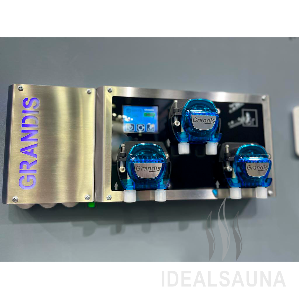 Система Grandis AROMA предназначена для подачи ароматизированной жидкости, в систему паропровода, идущий от парогенератора к парильне (хамаму). Дозирующий насос Grandis AROMA на основе высокоточной перистальтической системы в паре с мощным шаговым приводом работает в трех режимах: USER – ручной AUTO – автоматический REVERS – обратный режим В ручном режиме производится заправка системы, после чего дозирующий насос переводится в режим AUTO. В автоматическом режиме интервал и дозировки выбираем на пульте управления парогенератора.