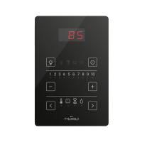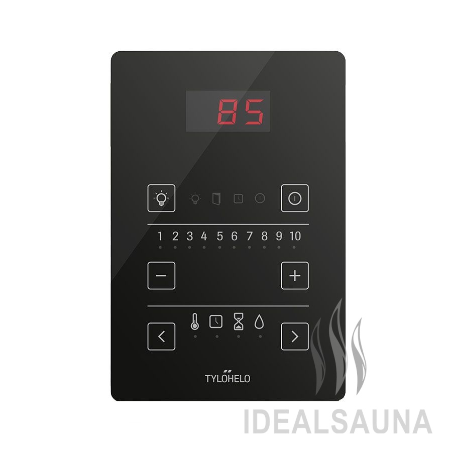 Тонкий чёрный пульт управления позволяет программировать освещение, температуру и время в сауне всего несколькими касаниями. Время включения сауны можно настроить заранее — вплоть до 10 часов.