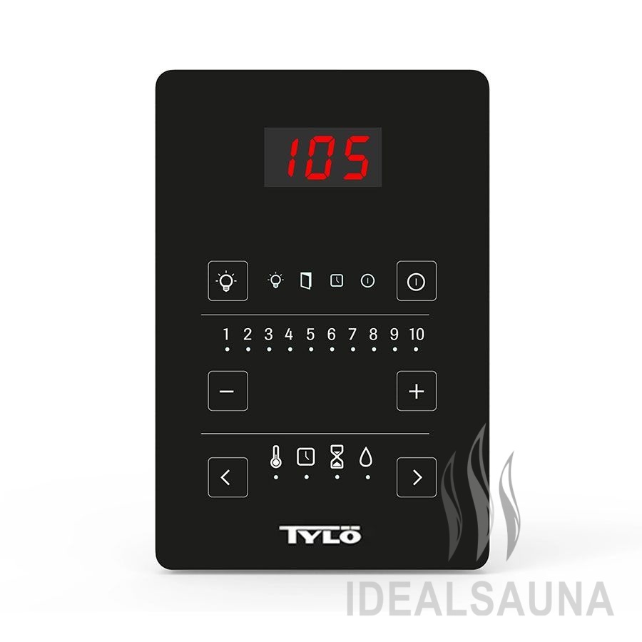 Тонкий чёрный пульт управления позволяет программировать освещение, температуру и время в сауне всего несколькими касаниями. Время включения сауны можно настроить заранее — вплоть до 10 часов.