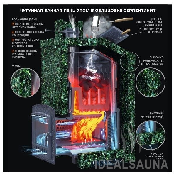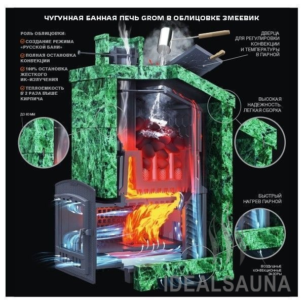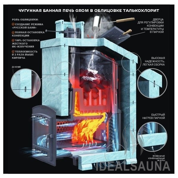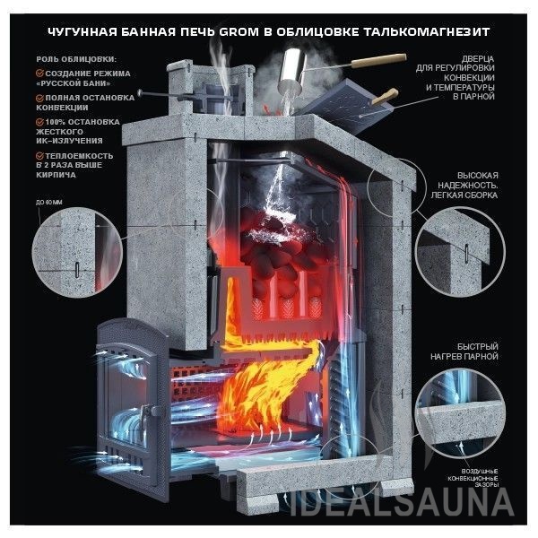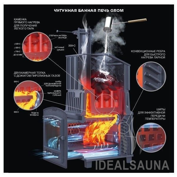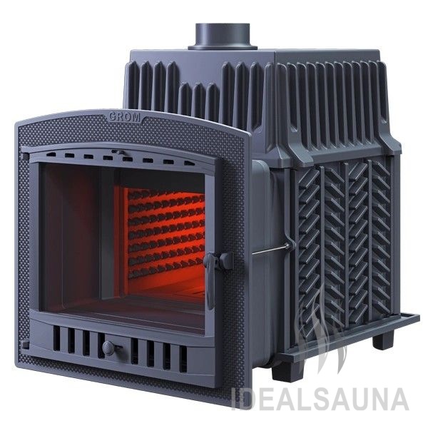 Grom – чугунная печь для бани премиум-класса повышенной надежности для использования в средних и крупных парных, включая коммерческие бани (гарантия 2 года на коммерческое использование, 10 лет для индивидуальной эксплуатации).