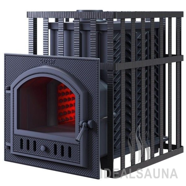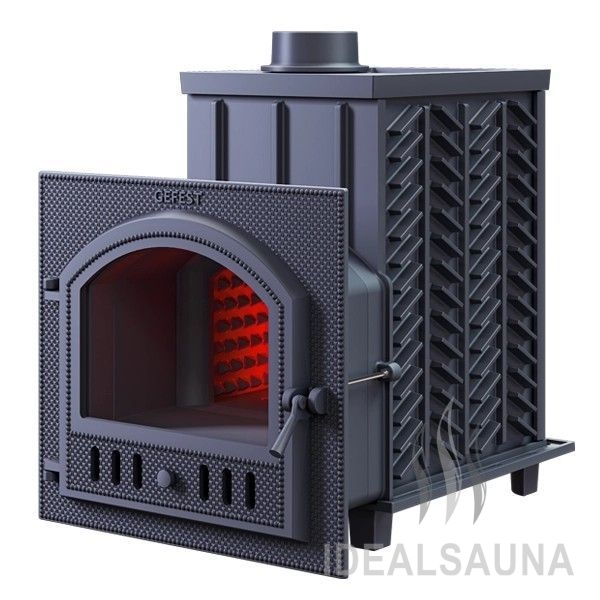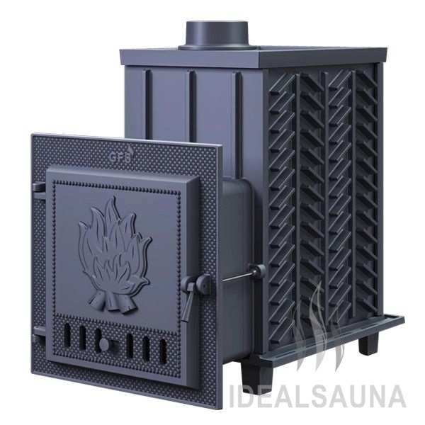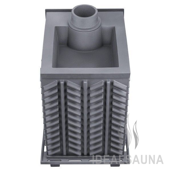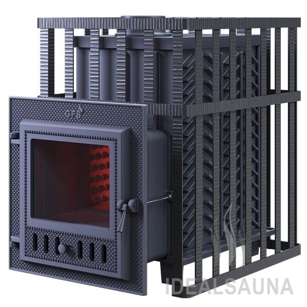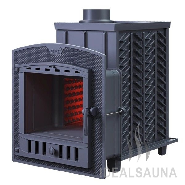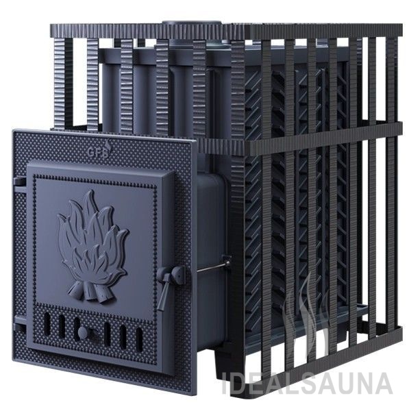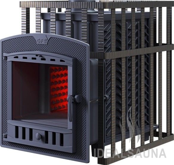 GFS ЗК в сетке 18 - печь с усиленной каменкой большей массы, с единым углублением внутрь топки для дополнительной укладки чугунного заряда. Теплосъемные шипы, со стороны горения пламени, в разы увеличивают площадь соприкосновения огня с каменкой и ускоряют передачу тепла, а также способствуют лучшему дожигу смешивая потоки пламени и воздуха поступаемого из воздушника. Эти усовершенствования значительно повышают мощность парообразования печи и выдают большее количество пара при непрерывной подаче воды. Каменка печей GFS-ЗК является незаливаемой.