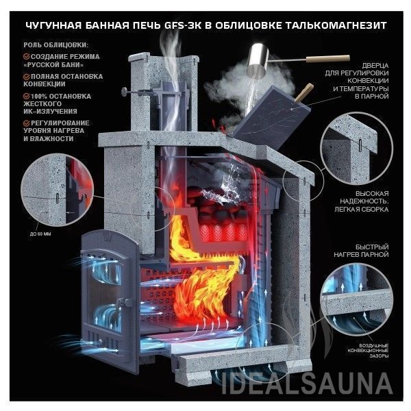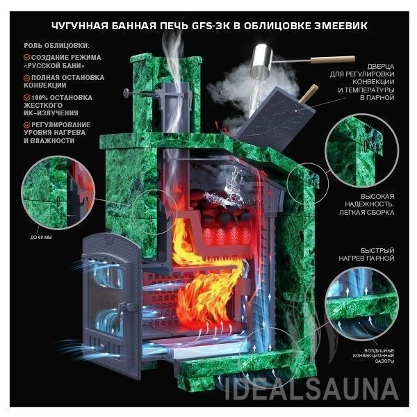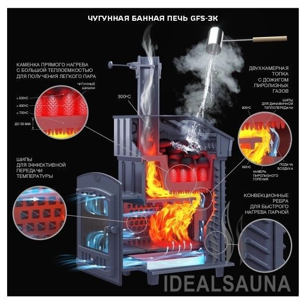 GFS-ЗК 25 - печь с усиленной каменкой большей массы, с единым углублением внутрь топки для дополнительной укладки чугунного заряда. Теплосъемные шипы, со стороны горения пламени, в разы увеличивают площадь соприкосновения огня с каменкой и ускоряют передачу тепла, а также способствуют лучшему дожигу смешивая потоки пламени и воздуха поступаемого из воздушника. Эти усовершенствования значительно повышают мощность парообразования печи и выдают большее количество пара при непрерывной подаче воды. Каменка печей GFS-ЗК является незаливаемой.