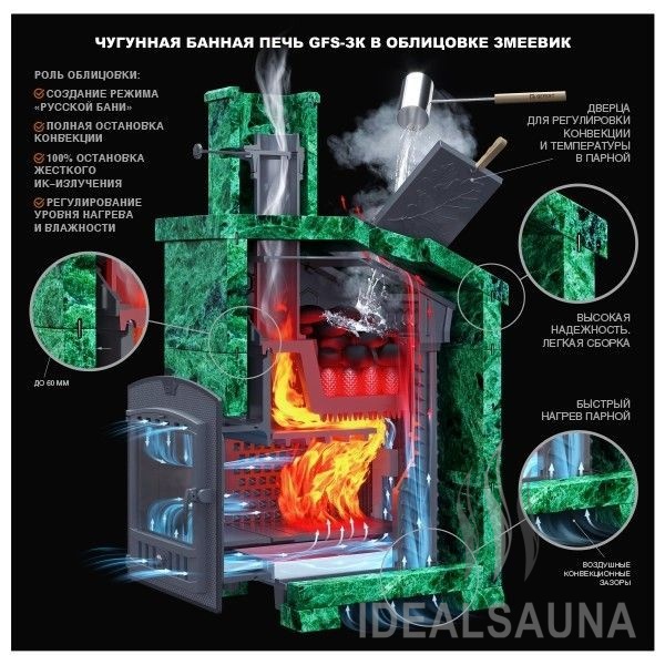 GFS-ЗК 30 - печь с усиленной каменкой большей массы, с единым углублением внутрь топки для дополнительной укладки чугунного заряда. Теплосъемные шипы, со стороны горения пламени, в разы увеличивают площадь соприкосновения огня с каменкой и ускоряют передачу тепла, а также способствуют лучшему дожигу смешивая потоки пламени и воздуха поступаемого из воздушника. Эти усовершенствования значительно повышают мощность парообразования печи и выдают большее количество пара при непрерывной подаче воды. Каменка печей для бани GFS-ЗК является незаливаемой.