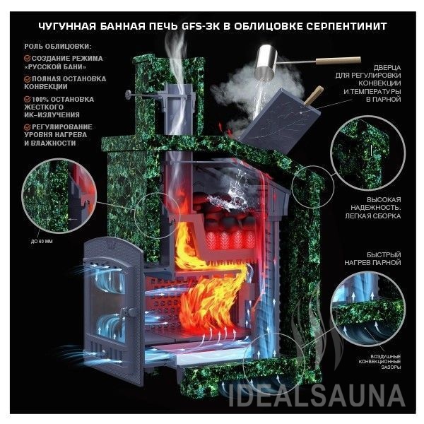 GFS-ЗК 18 - печь с усиленной каменкой большей массы, с единым углублением внутрь топки для дополнительной укладки чугунного заряда. Теплосъемные шипы, со стороны горения пламени, в разы увеличивают площадь соприкосновения огня с каменкой и ускоряют передачу тепла, а также способствуют лучшему дожигу смешивая потоки пламени и воздуха поступаемого из воздушника. Эти усовершенствования значительно повышают мощность парообразования печи и выдают большее количество пара при непрерывной подаче воды. Каменка печей GFS-ЗК является незаливаемой.