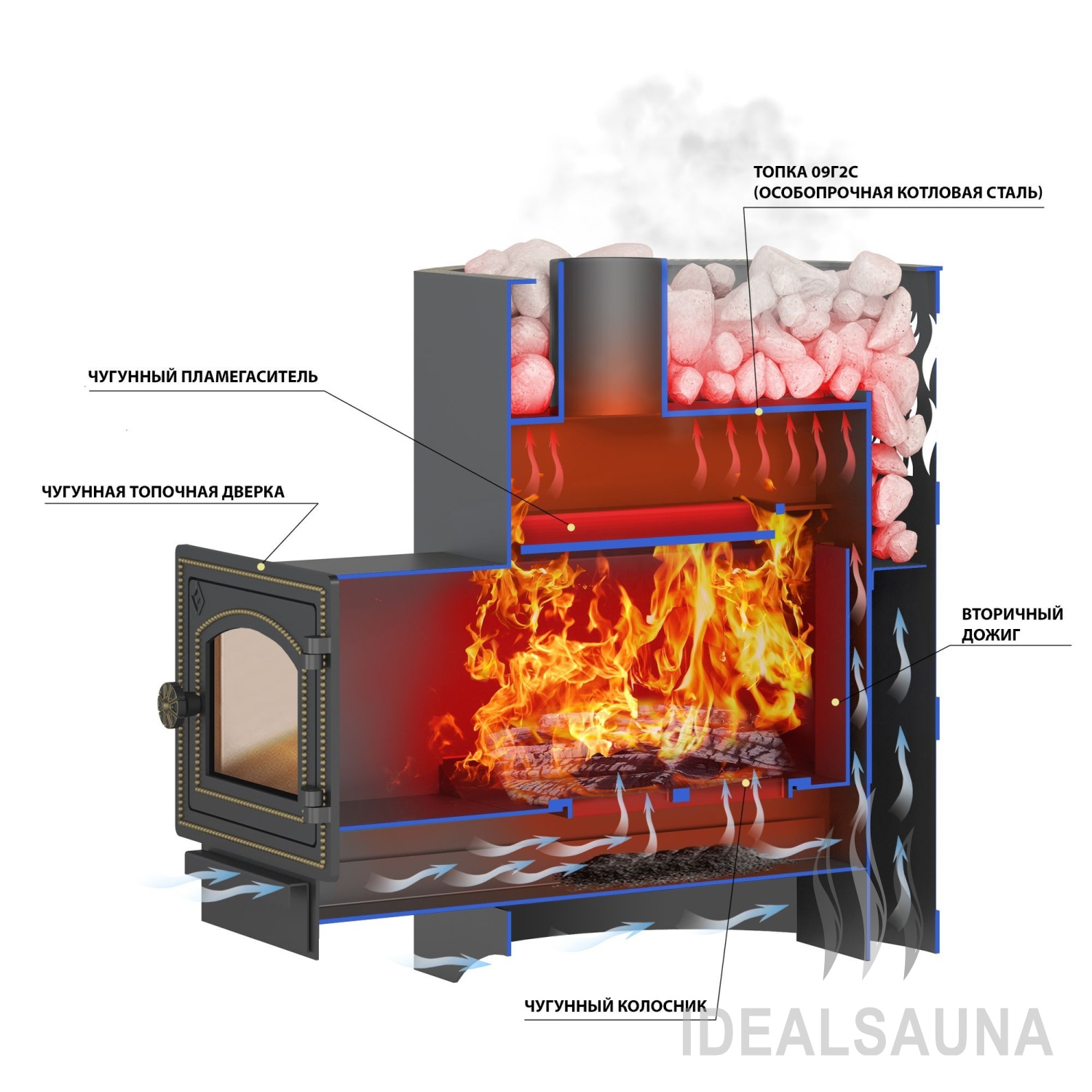 Конвекционно-вентилируемый кожух, вмещающий до 50 кг камней.