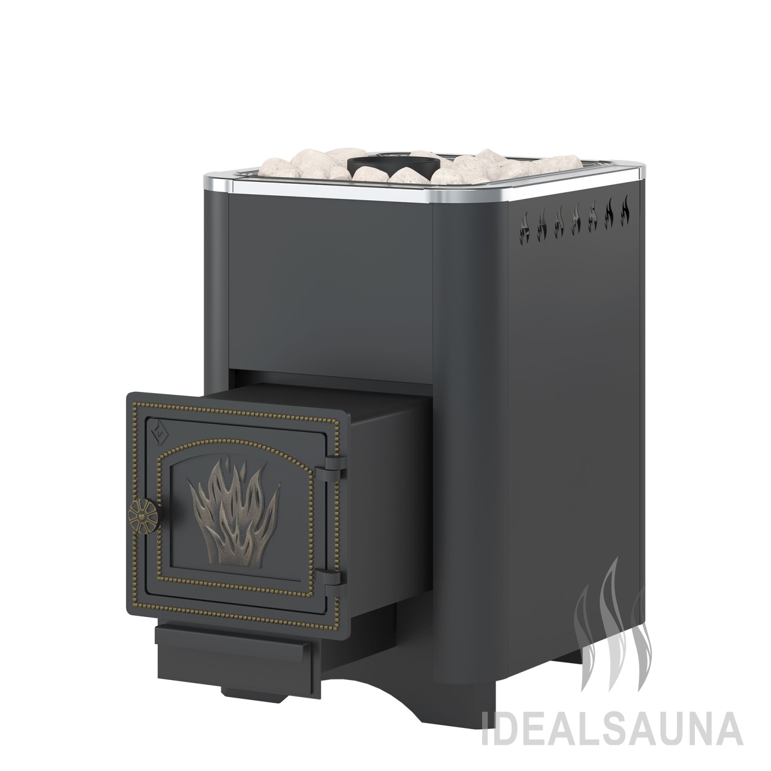 Стальной кожух печи зафиксирован на корпусе, для улучшения конвекции оснащён прорезными отверстиями в верхней части. Внутренние вырезы обеспечивают попадание холодного воздуха к камням, наружные – нагрев воздуха в парной.